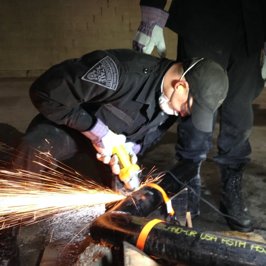 A police officer attempting to cut through a lockbox.