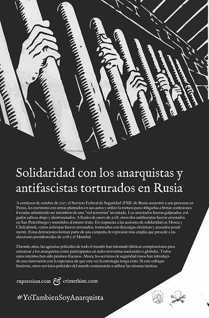 A comiezos de octubre de 2017, el Servicio Federal de Seguridad (FSB) de Rusia secuestró a seis personas en Penza, les incriminó con armas plantados en sus autos y utilizó la tortura para obligarlas a firmar confesiones forzadas admitiendo ser miembros de una “red terrorista” inventada. Los arrestados fueron golpeados, colgados cabeza abajo y electrocutados. A finales de enero de 2018, otros dos antifascistas fueron arrestados en San Petersburgo y sometidos al mismo trato. En respuesta a las acciones de solidaridad en Moscú y Chelyabinsk, varios activistas fueron arrestados, torturados con descargas eléctricas y acusados penalmente. Estas detenciones forman parte de una campaña de represión más amplia que precede a las elecciones presidenciales de 2018 y el Mundial.